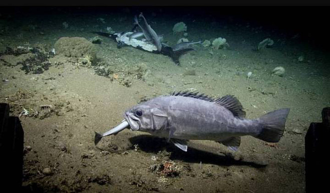 Trong lúc đang quay phim đàn cá mập xâu xé con cá kiếm, các nhà nghiên cứu vô cùng bất ngờ khi bắt gặp một loài cá khá to lớn thuộc bộ cá vược (wreckfish) bất ngờ tiến tới và đớp trọn một con cá mập nhỏ đang bơi gần con cá kiếm.