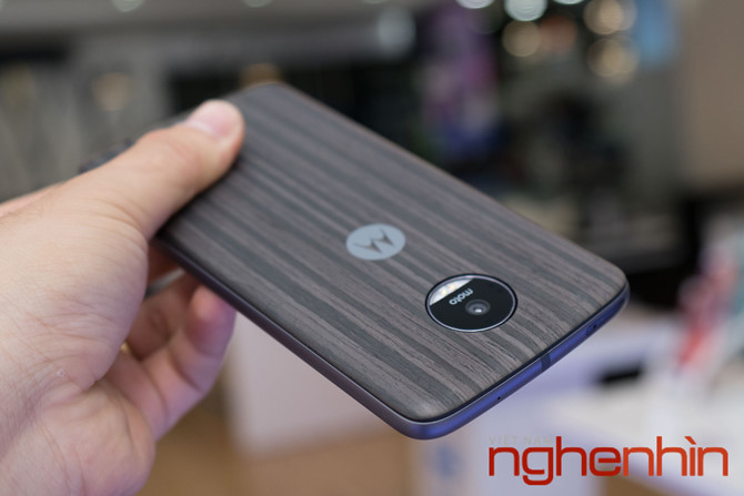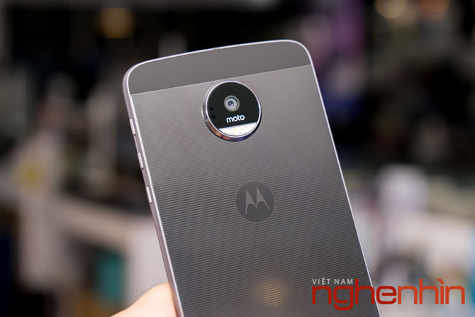 Mặt lưng của Moto Z được thiết kế rất ấn tượng với cụm camera chính gắn liền đèn Flash LED trong một vành tròn lớn nổi cao trên nền kim loại kẻ sọc ngang lịch lãm. Phía trên camera và bên dưới bộ tiếp điểm (dành cho mô-đun gắn thêm) là 2 dải kính đen sang trọng (như trên iPhone 5s). 16 tiếp điểm kết nối mô-đun loa, pin, máy chiếu... được xếp thành 2 hàng ngang vàng óng bắt mắt.