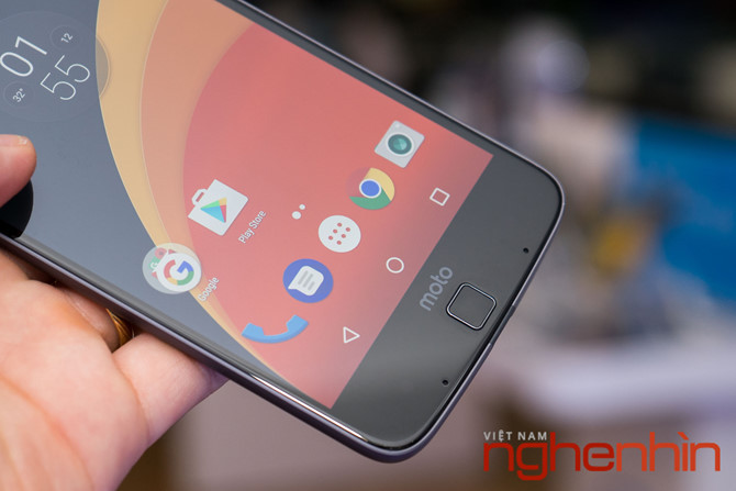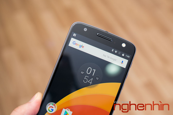 Tuy mặt trước của Moto Z không gây được ấn tượng tốt như lưng máy, nhưng cũng khá "mượt" và tinh xảo với mặt kính vê cong 2,5D. Cấu trúc mặt trước gây cảm giác các chi tiết bị làm hơi "lố", đặc biệt là loa thoại và flash lồi trông khá thô. Việc dành chỗ cho tên máy Moto và cảm biến vân tay làm tốn diện tích mặt trước, trong khi cụm phím điều hướng lại chiếm chỗ trong màn hình. Bù lại, Moto Z được trang bị màn hình cảm ứng AMOLED 5,5 inch độ phân giải 2K hiển thị đẹp, màu sắc chân thực.