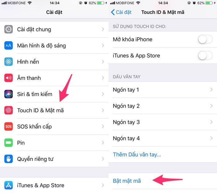 Đầu tiên, bạn hãy truy cập vào phần Settings (cài đặt) trên iPhone, iPad, kéo xuống bên dưới và chọn Touch ID & Passcode (Touch ID & mật mã), nhập mật khẩu khóa màn hình khi được yêu cầu. Sau đó, bạn hãy chọn Turn Passcode Off (tắt mật mã).