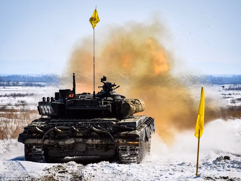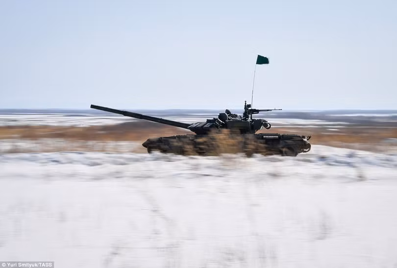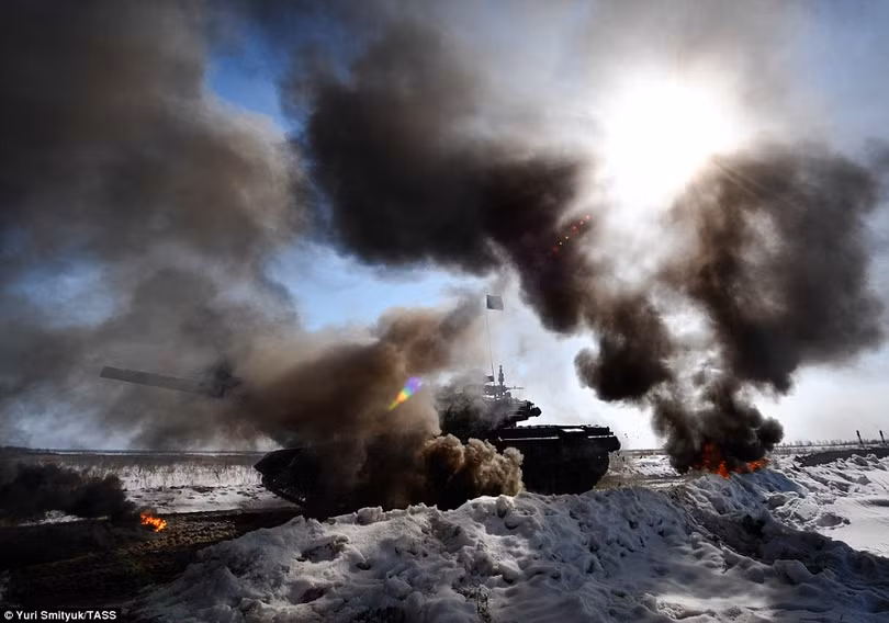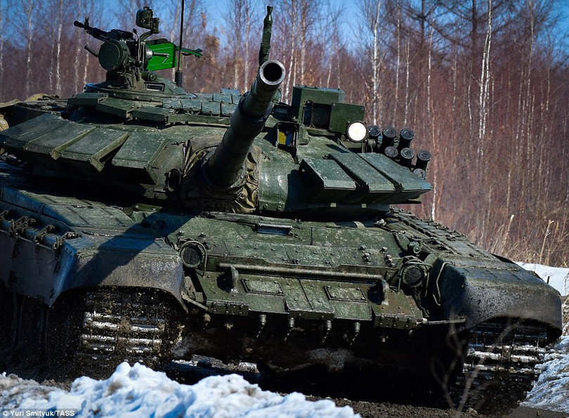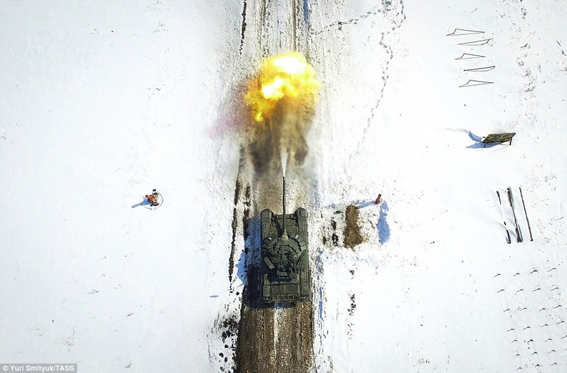 Chiếc xe tăng T-72B thực hiện bắn trong điều kiện khắc nghiệt trên cánh đồng đầy tuyết phủ của thao trường Anastasyevsky quân khu phía Đông nước Nga