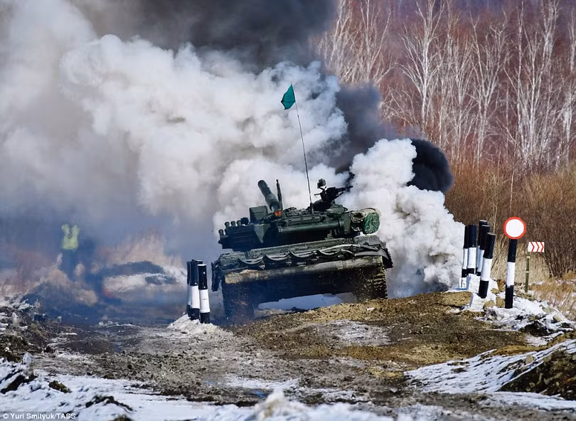Chiếc xe tăng T-72B xả khói mù mịt trong cuộc đua tốc độ