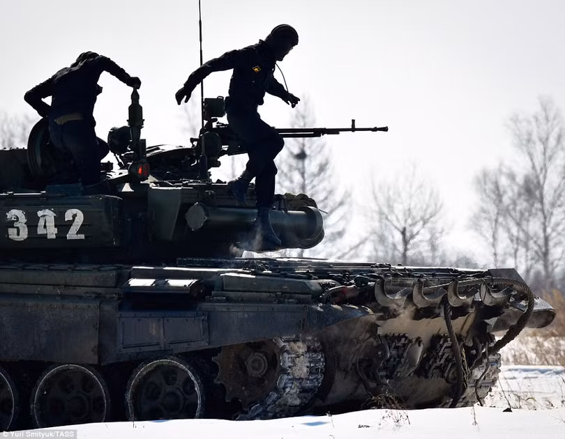 Kíp xe tăng T-72B làm việc trong thời tiết giá lạnh của mùa xuân nước Nga