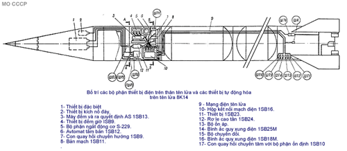 Tên lửa 8K14 - là tên lửa đạn đạo với động cơ tên lửa sử dụng nhiên liệu lỏng (LRE), hệ thống điều khiển đạo hàng quán tính tự định hướng, hệ thống tự hủy đầu đạn khi có sự cố và các đầu đạn không thể tháo rời trên quỹ đạo bay. Động cơ nhiên liệu lỏng (LRE) đẩy tên lửa bay với tầm bắn tối đa là 300 km (bán kính tối thiểu - 50 km). Tầm bắn hiệu quả là - 275 km. Dự trữ nhiên liệu của động cơ-100s. Hệ thống điều khiển tên lửa 8K14 được thiết kế để chuẩn bị khởi động động cơ tên lửa, phóng tên lửa và điều khiển đường bay của tên lửa.