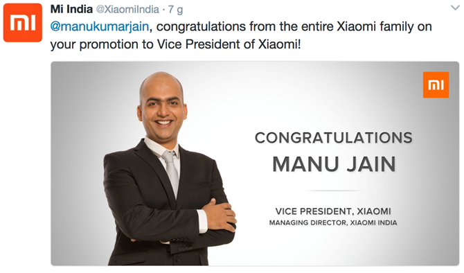 Phó Chủ tịch Xiaomi Hugo Barra - người có công lớn đưa thương hiệu Xiaomi ra thị trường quốc tế đã từ chức vào cuối năm 2016 để chuyển sang làm việc tại Facebook trong mảng thực tế ảo. Xiaomi đã chọn được một người thay thế xứng đáng cho vị trí này, đó chính là Manu Kumar Jain.