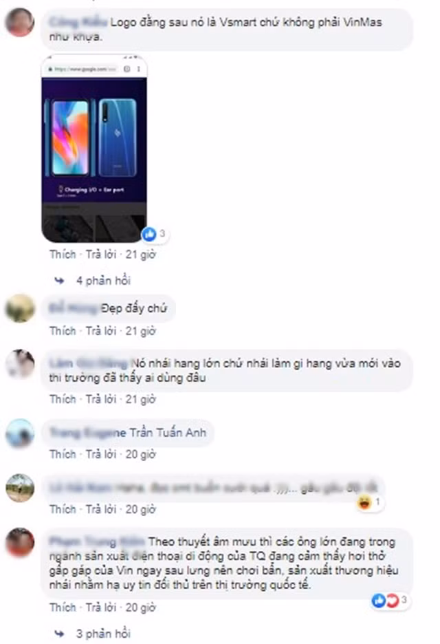 Một bình luận nhận được nhiều lượt thích cho rằng: “Các thương hiệu điện thoại trên thế giới sẽ chuyển qua OEM qua nhà máy Vsmart. Đó chắc chắn là tính toán của các các chuyên gia tư vấn khi chi phí và cuộc chiến tranh thương mại Mỹ - TQ ngày càng khốc liệt. Mình ủng hộ Vin.