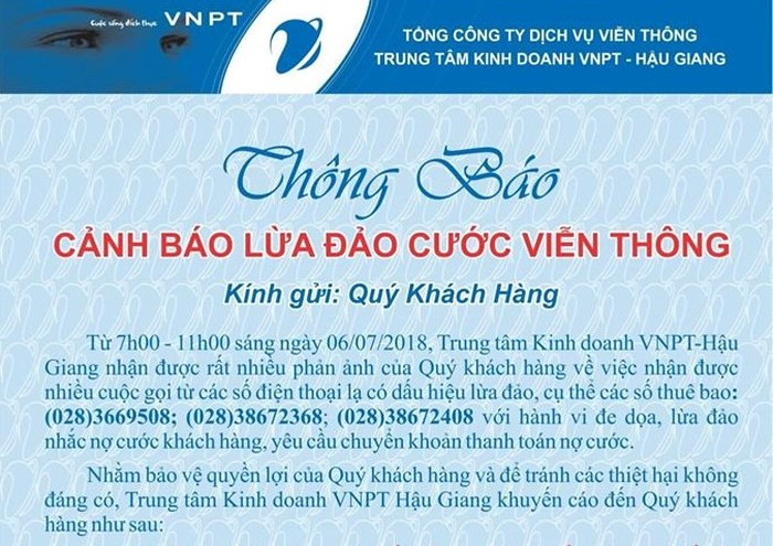 Trước thực trạng đó, nhằm bảo vệ quyền lợi của khách hàng và để tránh các thiệt hại không đáng có, Trung tâm Kinh doanh VNPT Hậu Giang đã có công văn khuyến cáo đến khách hàng với nội dung: Khi nhận được các cuộc gọi từ số điện thoại lạ, có dấu hiệu nghi vấn tin nhắn lừa đảo qua Email, khách hàng tuyệt đối không làm theo yêu cầu; Tuyệt đối không chuyển tiền, cung cấp số tài khoản, thông tin cá nhân CMND theo yêu cầu các đối tượng trên qua điện thoại; Khẩn trương Thông báo cho cơ quan Công an địa phương gần nhất và Trung tâm Kinh doanh VNPT Hậu Giang khi khách hàng nghi ngờ các dấu hiệu lừa đảo, khách hàng không nên tự xử lý.