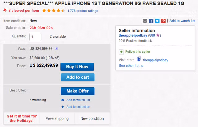 Trên trang mua bán Ebay của Mỹ, thỉnh thoảng chúng ta vẫn có thể thấy những người bán hàng "sưu tầm", đa số đều có bề ngoài rất đẹp, nhưng các sản phẩm thậm chí còn cả seal của hộp chưa bóc lại khá hiếm. Với một chiếc iPhone đời đầu còn nguyên seal, giá trị của nó có thể lên đến 20.000 USD khi đăng bán trên Ebay - Và chủ nhân của chiếc iPhone lần này đã nhận được một lời đề nghị mua lại với cái giá 22.000 USD.