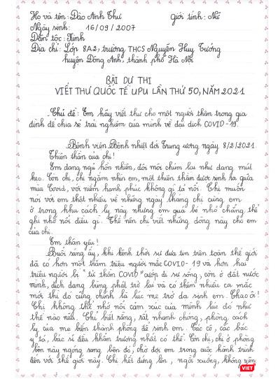 | Toàn văn bức thư của em Đào Anh Thư - trường THCS Nguyễn Huy Tưởng, huyện Đông Anh, TP. Hà Nội - vừa đoạt giải Nhất Quốc gia cuộc thi Viết thư quốc tế UPU lần thứ 50 (2021) |