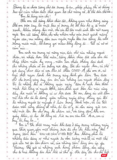 Riêng chủ nhân của bức thư đoạt giải Nhất lựa chọn ý tưởng gửi thư cho em bé gái được sinh ra khi mẹ đang điều trị COVID-19 tại Bệnh viện Bệnh Nhiệt đới Trung ương để nói lên những khó khăn, vất vả của các y bác sĩ và tự hào về sự đóng góp của họ trong công tác phòng chống dịch ở Việt Nam: “Bế em trên tay là một bác sĩ trong bộ bảo hộ y tế màu xanh, khẩu trang kín mít, chỉ còn hở đôi mắt ánh lên nét rạng ngời... Tiếng khóc chào đời của em đã thắp thêm niềm hy vọng, niềm tin chiến thắng đại dịch cho những chiến sĩ áo trắng nơi đây... Bên trong tấm biển “KHU VỰC CÁCH LY ĐẶC BIỆT” kia không phải là những điều đáng sợ như người ta vẫn tưởng mà là cả một thế giới của sự ân cần chăm sóc, của những tấm lòng ấm áp yêu thương...”. Bức thư là lời thủ thỉ kể chuyện của chị với cô em gái bé bỏng vừa được sinh ra trong đại dịch rất chân thực, xúc động mang thông điệp rõ ràng, cách trình bày lôgic, hợp lý.
