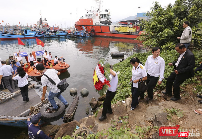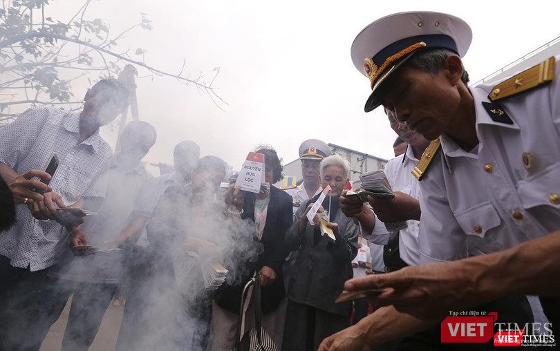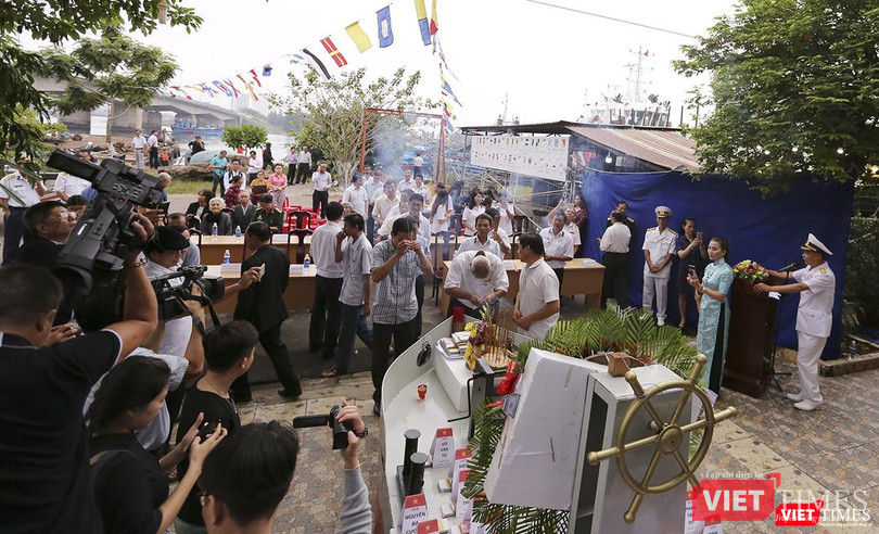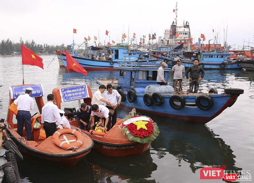 Sau lễ tưởng niệm, các thành viên cùng dâng hương và dong thuyền hướng ra cửa biển để thả đèn, hoa ngưỡng vọng linh hồn 64 cán bộ chiến sỹ, đồng đội, đồng chí đang nằm lại với mẹ biển bao la.