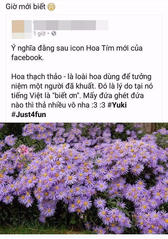 Bất ngờ xuất hiện từ ngày 12/5, biểu tượng "hoa tím" nằm trong mục Reaction bên cạnh những nút như Yêu Thích, Buồn, Phẫn Nộ,... đang tràn ngập trên mạng xã hội Facebook. Tuy nhiên có rất nhiều người sử dụng nó với lý do "thấy mới nên dùng thử", mà không biết đến ý nghĩa đằng sau hình ảnh bông hoa tím được Facebook truyền tải.