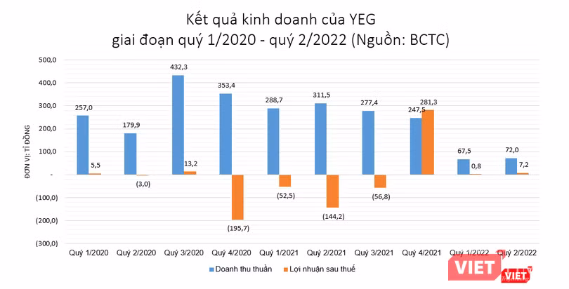 Trong quý 2/2022, YEG ghi nhận doanh thu thuần đạt 72 tỉ đồng, giảm đến 77% so với cùng kỳ năm ngoái. Giá vốn hàng bán giảm tới 85% so với cùng kỳ năm trước giúp YEG ghi nhận khoản lợi nhuận gộp đạt 20,2 tỉ đồng. Trừ đi chi phí, YEG ghi nhận lợi nhuận sau thuế đạt 7,2 tỉ đồng, trong khi quý 2/2021 báo lỗ đến 144,2 tỉ đồng.