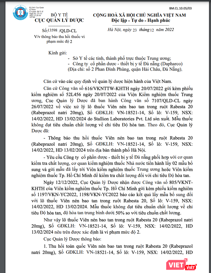 Cục Quản lý Dược quyết định thu hồi toàn quốc lô thuốc viên nén bao tan trong ruột Rabesta 20 (Rabeprazol natri 20mg) do Stallion Laboratories Pvt. Ltd sản xuất, Công ty cổ phần dược - thiết bị y tế Đà nẵng (Dapharco) nhập khẩu. Bên cạnh đó, trong vòng 2 ngày, kể từ ngày Cục Quản lý Dược ký công văn thu hồi, Công ty Cổ phần Dược - Thiết bị y tế Đà Nẵng phải phối hợp với nhà phân phối thuốc thu hồi toàn bộ lô thuốc không đạt tiêu chuẩn chất lượng nêu trên.