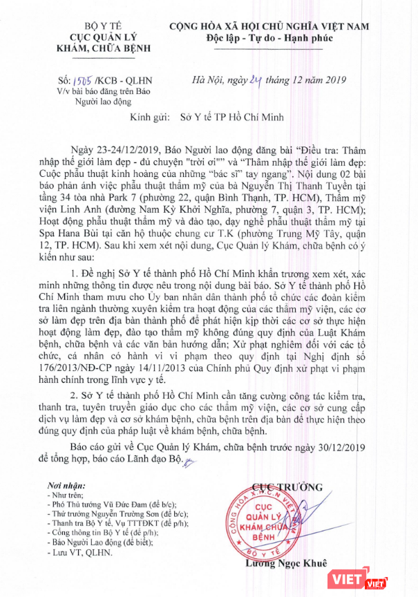 Vì thế, Cục Quản lý Khám, chữa bệnh yêu cầu Sở Y tế TP. Hồ Chí Minh khẩn trương xem xét, xác minh những thông tin được nêu về việc "bác sĩ tay ngang" phẫu thuật làm đẹp.