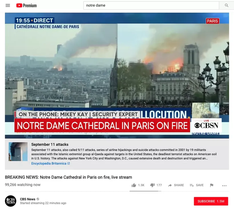 Đoạn mô tả nhỏ ở dưới video là một tính năng mà YouTube đưa vào nhằm bổ sung phần lịch sử cho một sự kiện đang xảy ra. Mục đích là để ngăn chặn những thông tin sai lệch trong các video trên nền tảng này. Phần thông tin được lấy chủ yếu từ Wikipedia và Encyclopedia. Nhưng thật kỳ lạ khi thuật toán của công ty lại liên kết vụ cháy Nhà thờ Đức Bà đến vụ khủng bố 11/9.