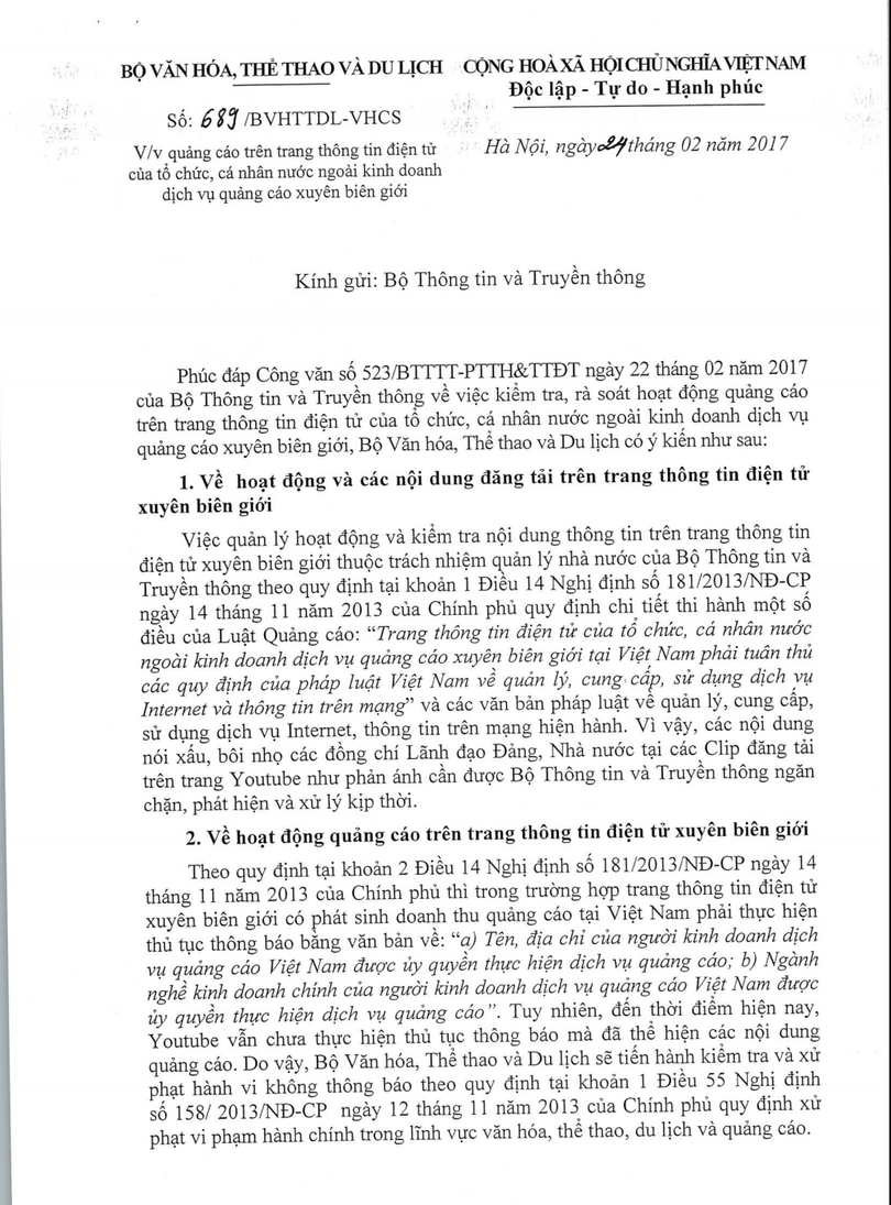 Theo đó, Bộ VH-TT&DL cho biết, việc quản lý hoạt động và kiểm tra nội dung thông tin trên trang thông tin điện tử xuyên biên giới thuộc trách nhiệm quản lý của Bộ TT&TT theo quy định tại khoản 1 Điều 14 Nghị định 181/2013/NĐ-CP ngày 14/11/2013 của Chính phủ quy định chi tiết thi hành một số điều của Luật Quảng cáo (Nghị định 181): Trang thông tin điện tử của tổ chức, cá nhân nước ngoài kinh doanh dịch vụ quảng cáo xuyên biên giới tại Việt Nam phải tuân thủ các quy định của pháp luật Việt Nam về quản lý, cung cấp, sử dụng dịch vụ Internet và thông tin trên mạng” và các văn bản pháp luật về quản lý, cung cấp, sử dụng dịch vụ Internet, thông tin trên mạng hiện hành. “Vì vậy, các nội dung nói xấu, bôi nhọ các đồng chí lãnh đạo Đảng, Nhà nước tại các clip đăng tải trên trang Youtube như phản ánh cần được Bộ TT&TT ngăn chặn, phát hiện và xử lý kịp thời.