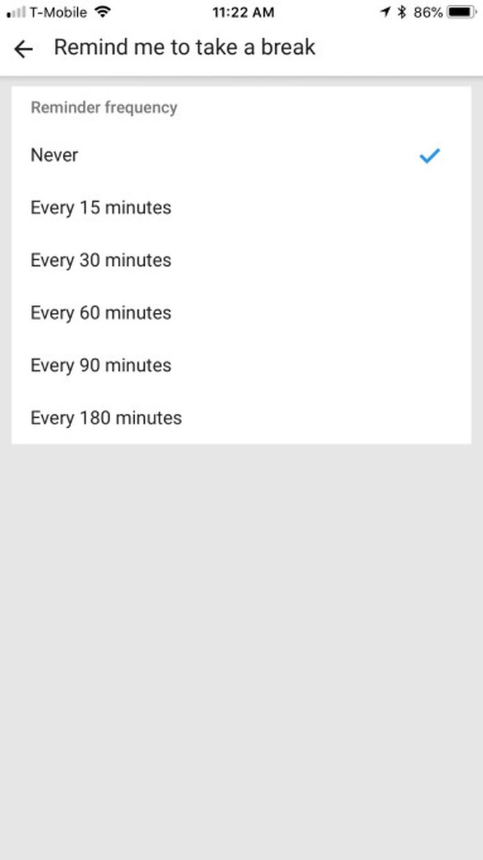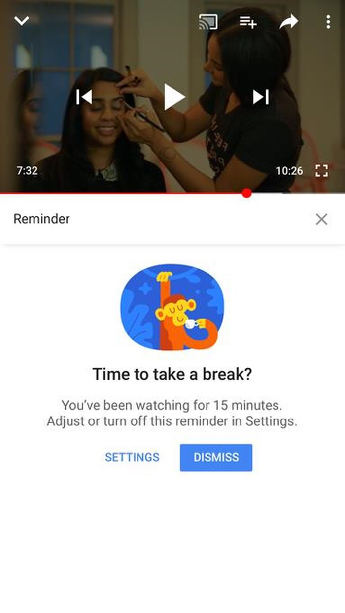 TechCrunch cho hay tính năng "Take a Break" này nằm trong màn hình Settings của ứng dụng YouTube cho thiết bị di động, người dùng có thể thiết lập một thông báo xuất hiện trong vòng 15, 30, 60, 90 hay 180 phút, đồng thời, video cũng sẽ tạm ngừng. Bạn có thể bỏ qua nhắc nhở này và tiếp tục xem hoặc là đóng ứng dụng.
