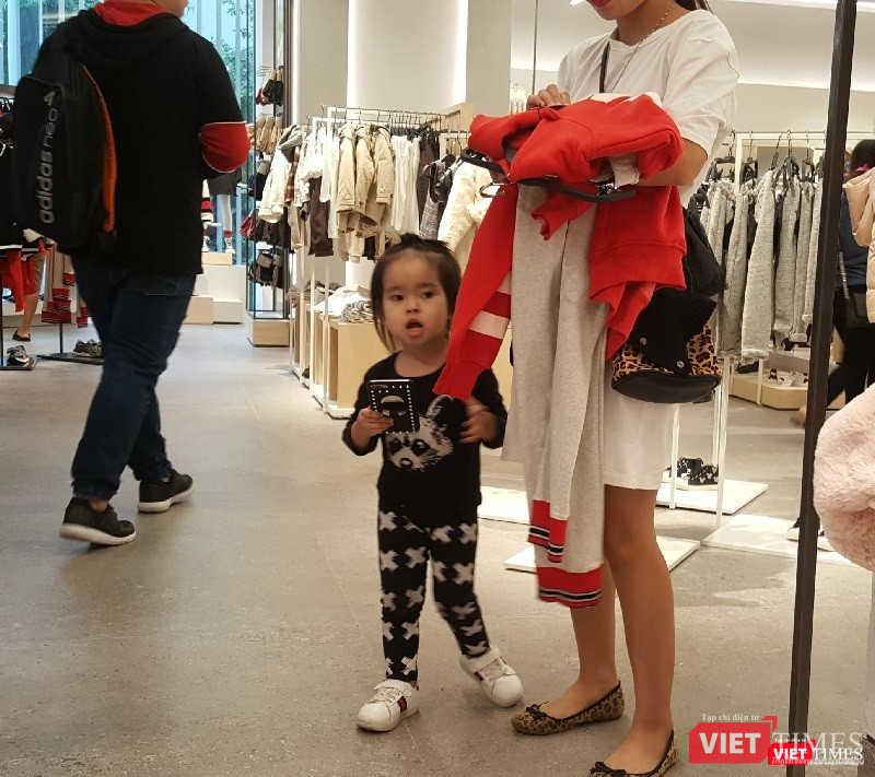 Tầng 2 là khu đồ TRF và đồ cho trẻ em. Ảnh: một khách hàng nhí được mẹ dẫn đi mua đồ.