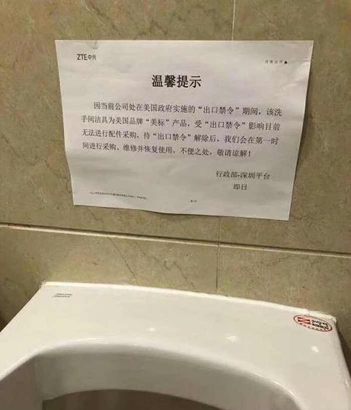 ZTE đã dán một mảnh giấy nhỏ trên bồn tiểu bị hư hỏng với nội dung: “Công ty hiện đang phải chịu lệnh cấm nhập khẩu do chính phủ Mỹ đặt ra. Vì thiết bị này là sản phẩm của American Standard nên chúng tôi không thể mua phụ tùng để sửa chữa do lệnh cấm nhập khẩu. Khi lệnh cấm được gỡ bỏ, chúng tôi hứa sẽ sửa chữa mọi thứ. Rất tiếc vì sự bất tiện này”.